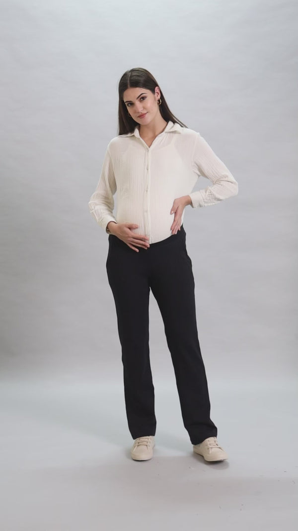 These maternity trousers offer a modern twist on comfort and flexibility. Featuring a low waist design, they sit comfortably below your bump, providing a relaxed fit that adapts to your changing body.